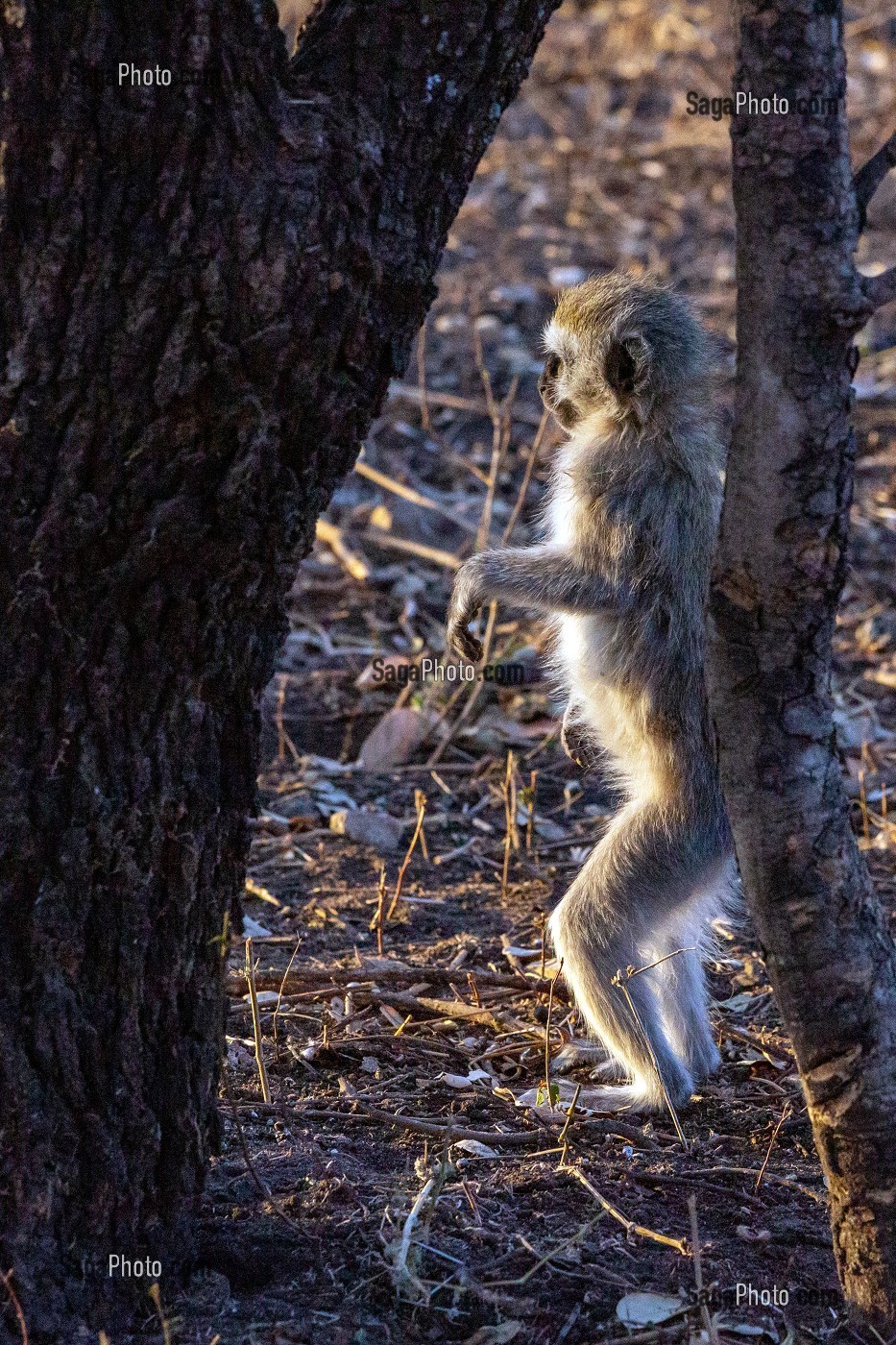 Descriptif : SINGE VERVET A FACE NOIR DEBOUT CONTRE UN ARBRE, PARC NATIONAL DE TARANGIRE, TANZANIE, AFRIQUE