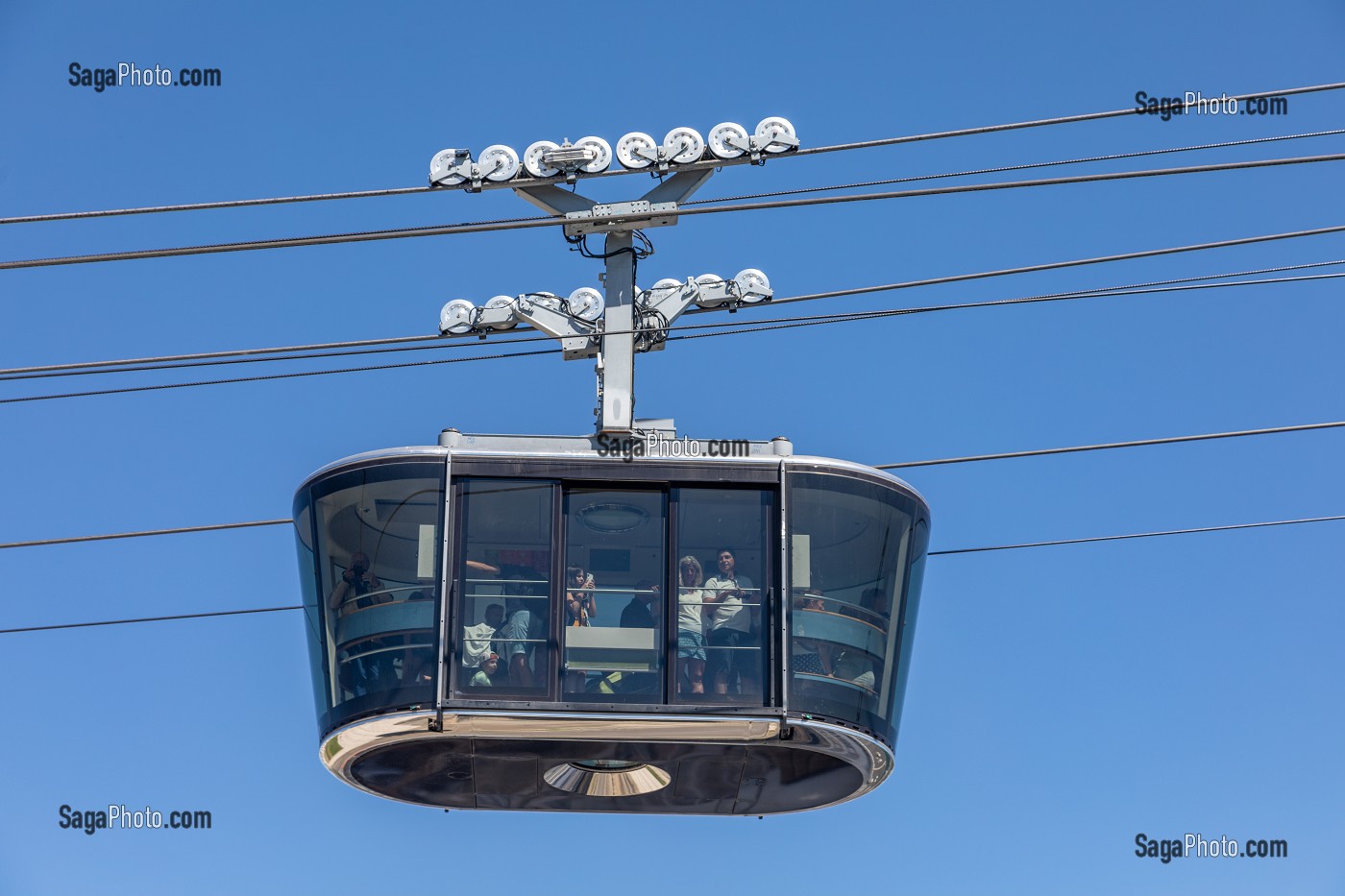 Descriptif : GROS PLAN SUR UNE CABINE DU TELEPHERIQUE QUI TRAVERSE LA RADE DE BREST POUR RELIER LE CENTRE HISTORIQUE DE BREST AUX ATELIERS DES CAPUCINS, PREMIER TELEPHERIQUE URBAIN EN FRANCE, PORT MILITAIRE DE BREST, BREST, FINISTERE, BRETAGNE, FRANCE