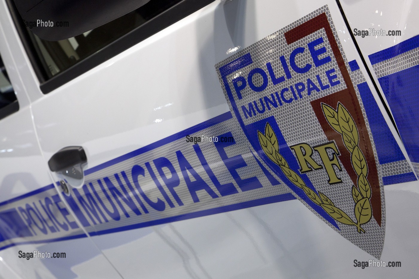 Descriptif : VEHICULE ET LOGO DE LA POLICE MUNICIPALE, AMBIANCE SALON DES MAIRES, PORTE DE VERSAILLES, PARIS (75), FRANCE