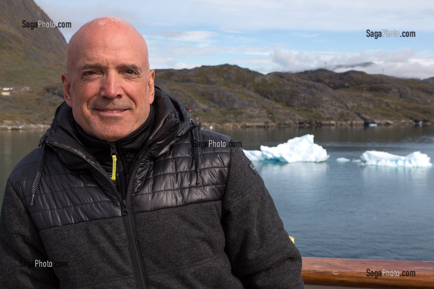 Mots clés : PERSONNAGE PUBLIC, HOMME, METEOROLOGUE, PRESENTATEUR, METEO, TELE, PETIT ECRAN, TV, TELEVISION, TF1, STATION DE RADIO, RTL, GROENLAND, TRANSPORT DE PASSAGERS, PAQUEBOT, BATEAU DE CROISIERE, DANEMARK, NARSAQ, BATEAU, EUROPE, RIVAGES DU MONDE, CROISIERE, ASTORIA, TERRE POLAIRE, PAYSAGE POLAIRE, FROID, GLACE, ICEBERG, LOUIS BODIN, PREVISIONNISTE, GLACIER