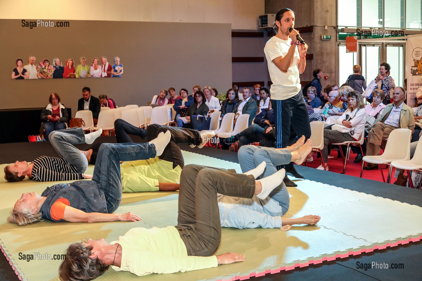 Descriptif : SEANCE DE YOGA ET MUSCULATION TRANQUILE, SALON DES SENIORS, PORTE DE VERSAILLES, PARIS (75), FRANCE