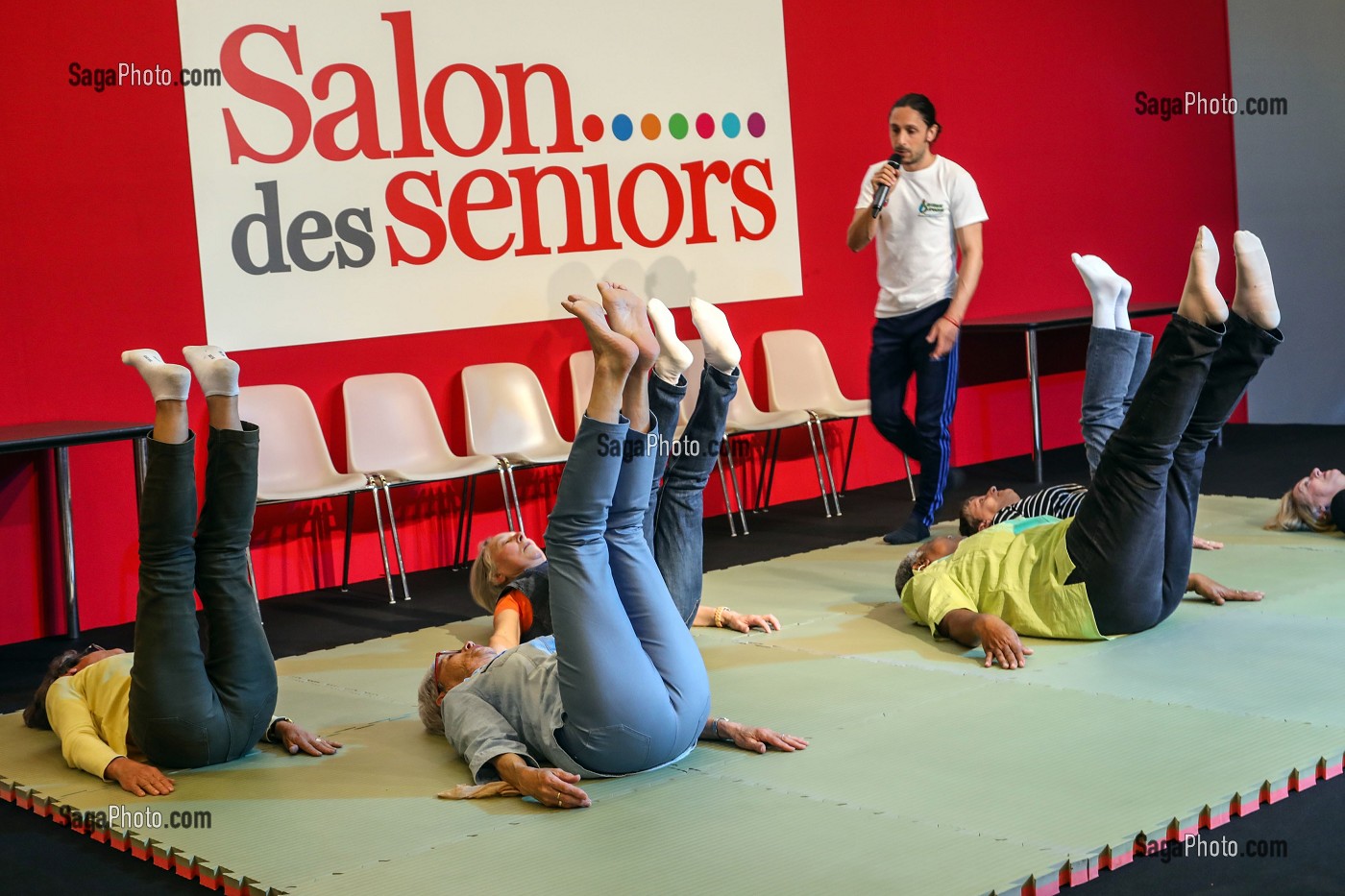 Descriptif : SEANCE DE YOGA ET MUSCULATION TRANQUILE, SALON DES SENIORS, PORTE DE VERSAILLES, PARIS (75), FRANCE