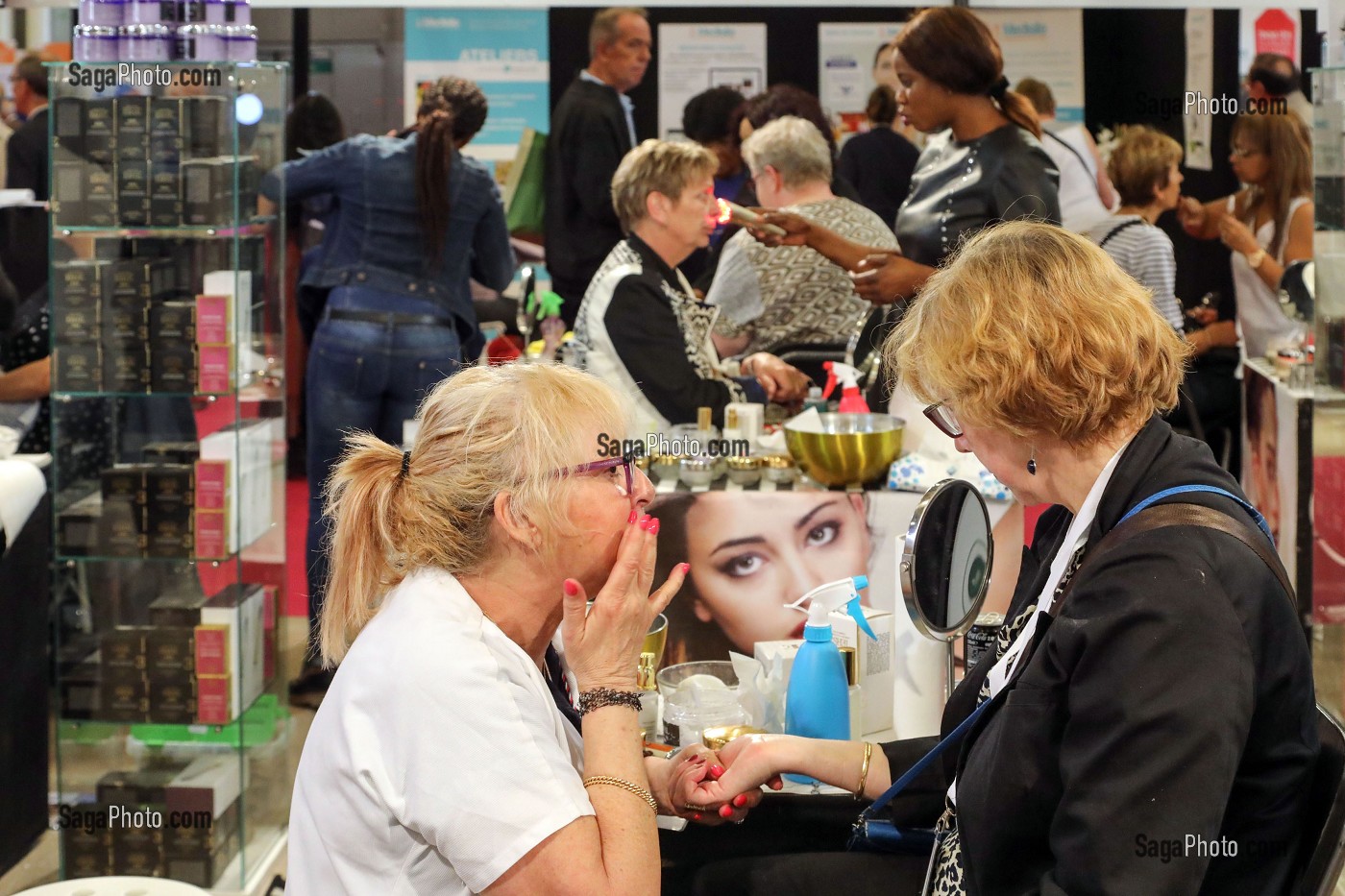 Descriptif : STAND DE SOINS CORPORELS ET DE BEAUTE, SALON DES SENIORS, PORTE DE VERSAILLES, PARIS (75), FRANCE