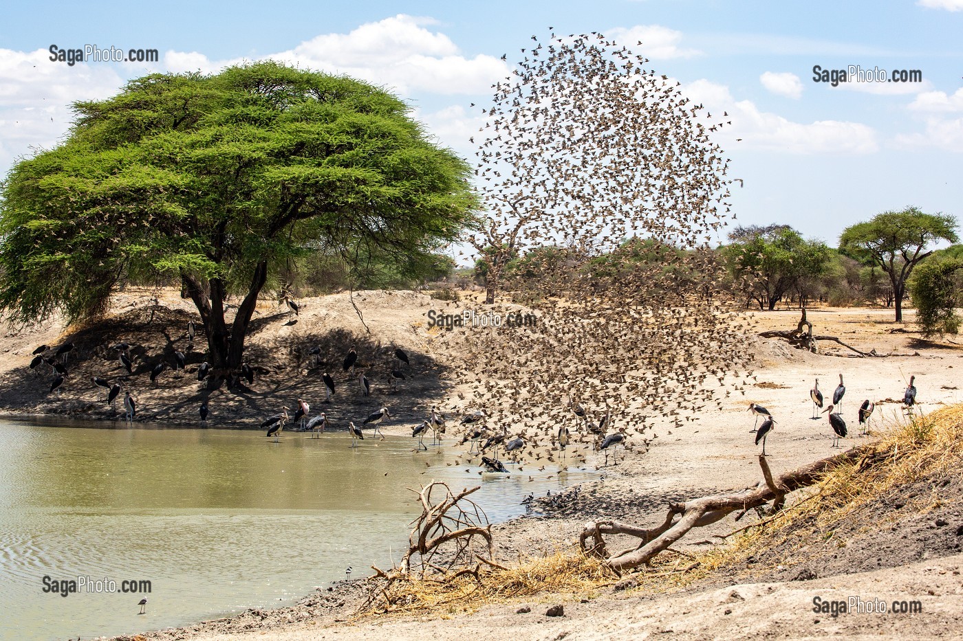 Descriptif : VOL EN NUAGE D'UN GROUPE DE TRAVAILLEURS A BEC ROUGE AVEC DES MARABOUTS PRES DU POINT D'EAU, PARC NATIONAL DE TARANGIRE, TANZANIE, AFRIQUE
