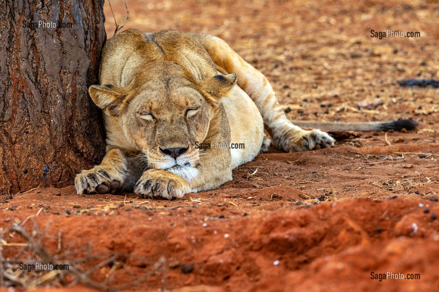 Descriptif : LIONNE AU REPOS QUI GARDE SA PROIE, PARC NATIONAL DE TARANGIRE, TANZANIE, AFRIQUE