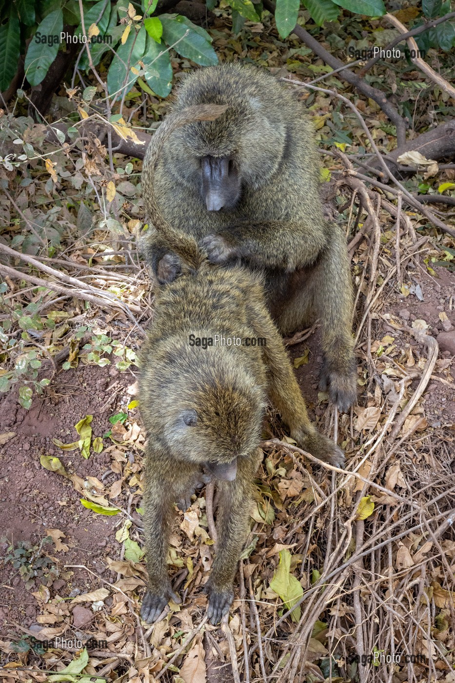 Descriptif : COUPLE DE BABOUINS EN SEANCE D'EPOUILLAGE, PARC NATIONAL DU LAC MANYARA, TANZANIE, AFRIQUE