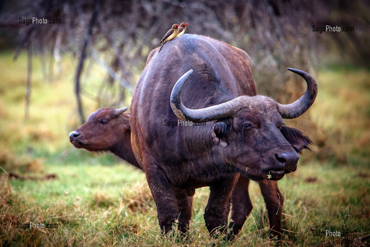 Descriptif : PIQUEBOEUFS A BEC ROUGE SUR LE DOS D'UN BUFFLE, PARC NATIONAL DU LAC MANYARA, TANZANIE, AFRIQUE