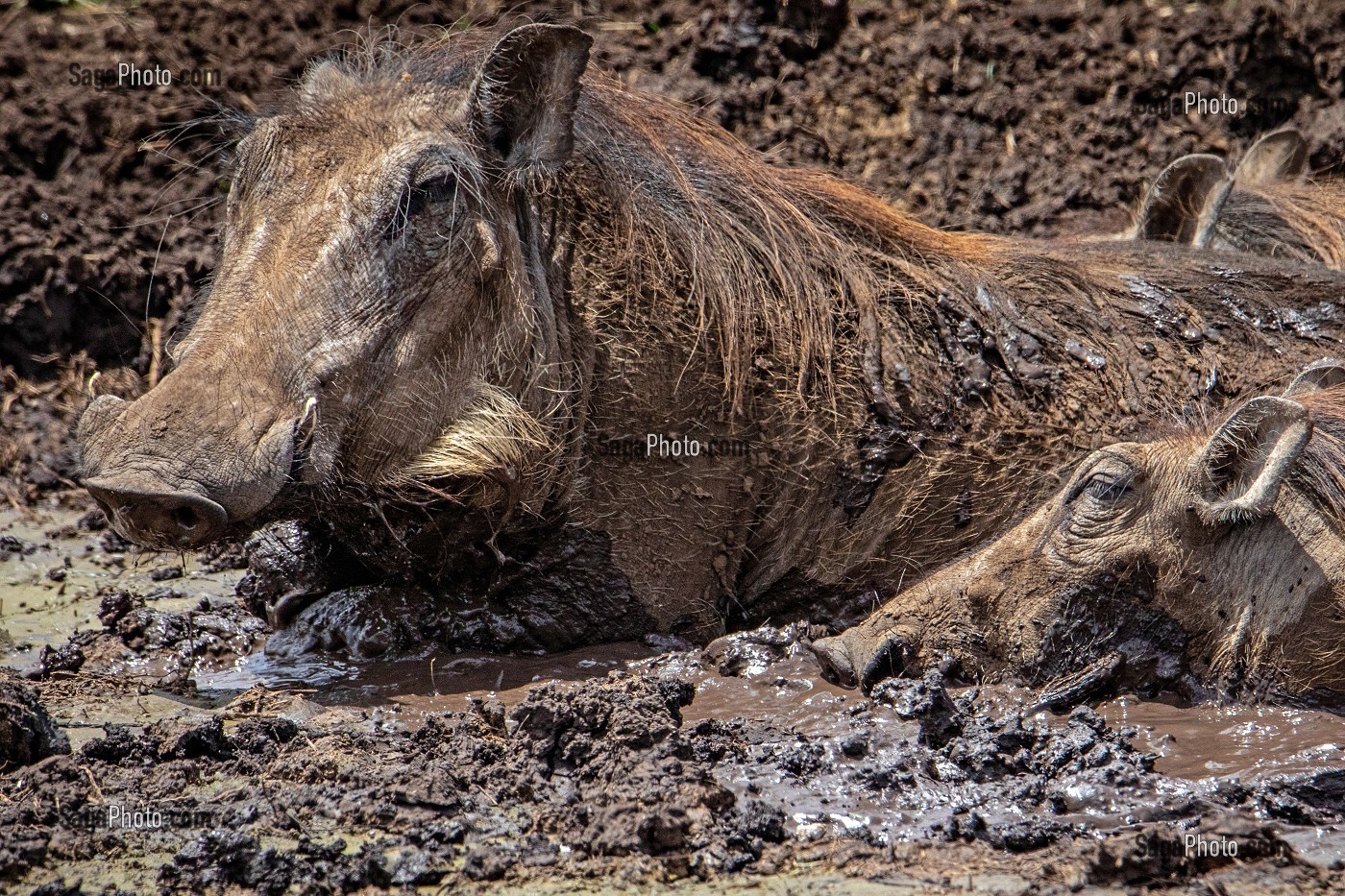 Descriptif : BAIN DE BOUE DES PHACOCHERES, PARC NATIONAL DU CRATERE DE NGORONGORO, TANZANIE, AFRIQUE