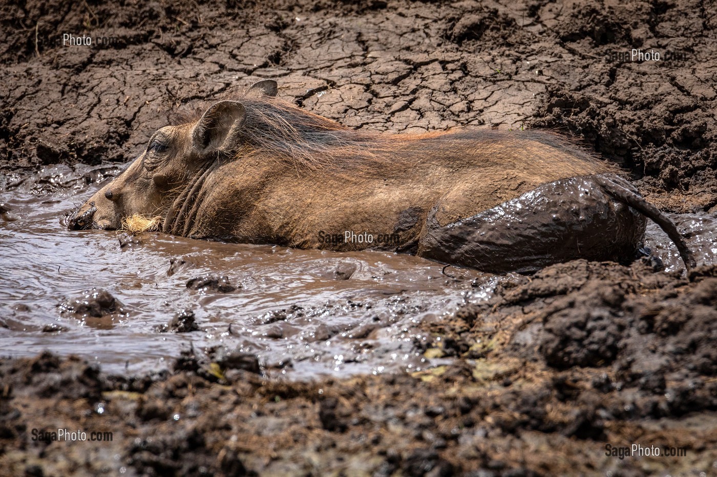 Descriptif : BAIN DE BOUE DES PHACOCHERES, PARC NATIONAL DU CRATERE DE NGORONGORO, TANZANIE, AFRIQUE