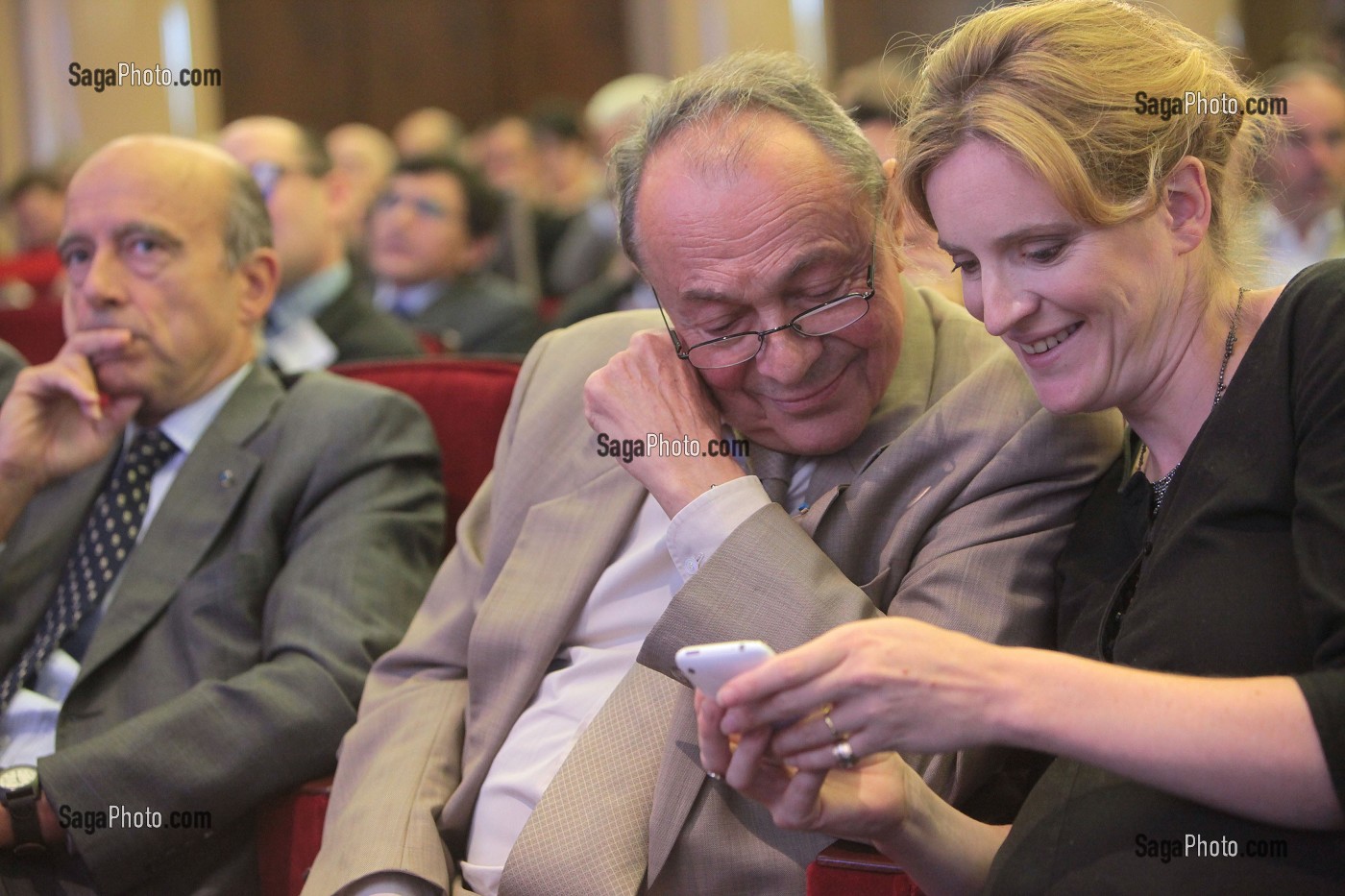 Descriptif : ALAIN JUPPE, MICHEL ROCARD, ANCIENS PREMIERS MINISTRES, CO-PRESIDENTS DE LA COMMISSION CHARGE D'IDENTIFIER LES PRIORITES DE L'EMPRUNT NATIONAL ET NATHALIE KOSCIUSKO-MORIZET, NKM, SECRETAIRE D'ETAT CHARGEE DE LA PROSPECTIVE ET DU DEVELOPPEMENT DE L'ECONOMIE NUMERIQUE REGARDANT L'IPHONE, SEMINAIRE NUMERIQUE : INVESTIR AUJOURD'HUI POUR LA CROISSANCE DE DEMAIN