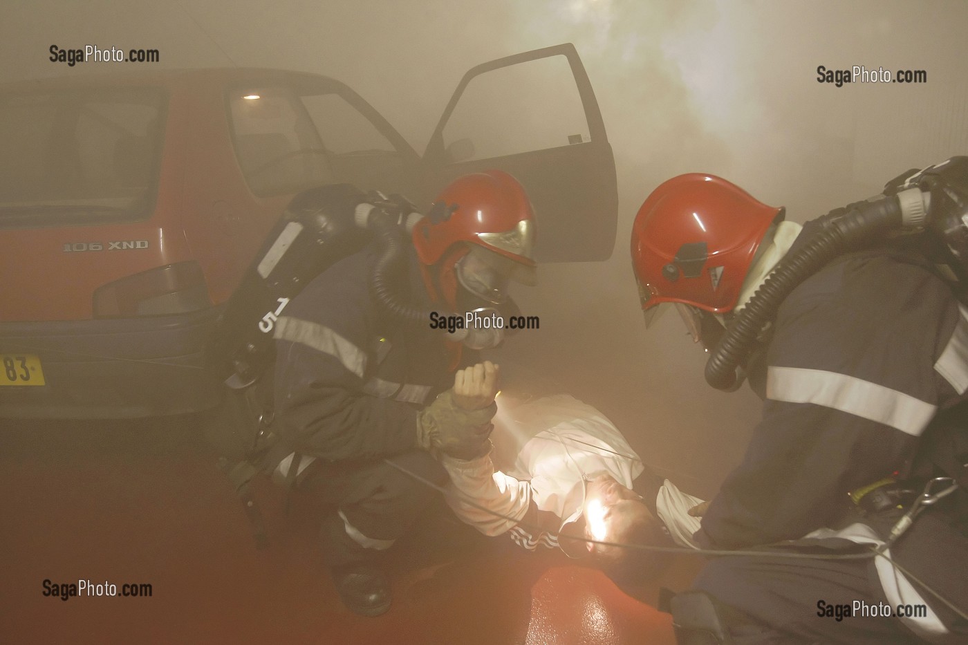 Descriptif : APPROCHE ET MISE EN SECURITE D'UNE VICTIME PAR L'EQUIPE DE SAPEURS-POMPIERS DU GROUPE D'INTERVENTION ET DE RECHERCHE (GIR) SUR UN FEU DE VOITURE DANS UN PARKING DE CANNES, ALPES-MARITIMES (06), FRANCE