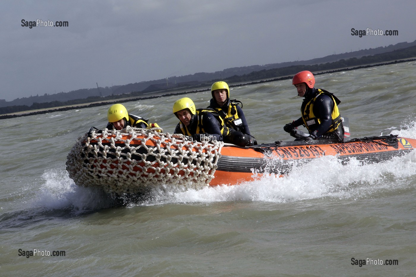 Descriptif : ENTRAINEMENT DE L'EQUIPE DU SECOURS COTIER DES SAPEURS-POMPIERS DE HONFLEUR DANS L'ESTUAIRE DE LA SEINE EN FACE DE LE HAVRE (PORT 2000), CALVADOS, FRANCE
