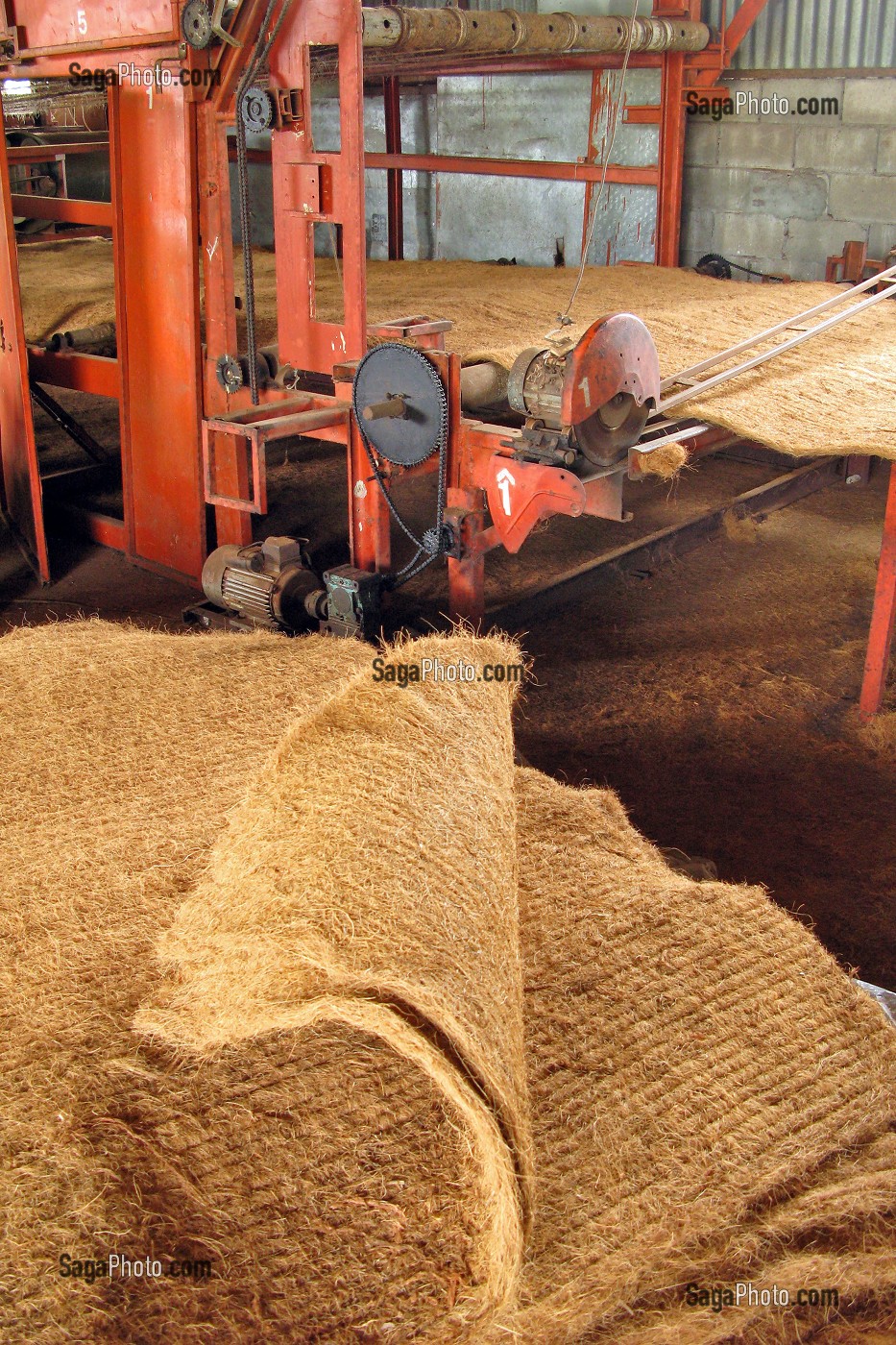 Descriptif : PASSAGE AU LAMINOIR DU COIR, FIBRES ENTOURANT LA COQUE DE LA NOIX DE COCO DES COCOTIERS UTILISE POUR LA CONFECTION DES MATELAS. PROVINCE DE BANG SAPHAN, THAILANDE