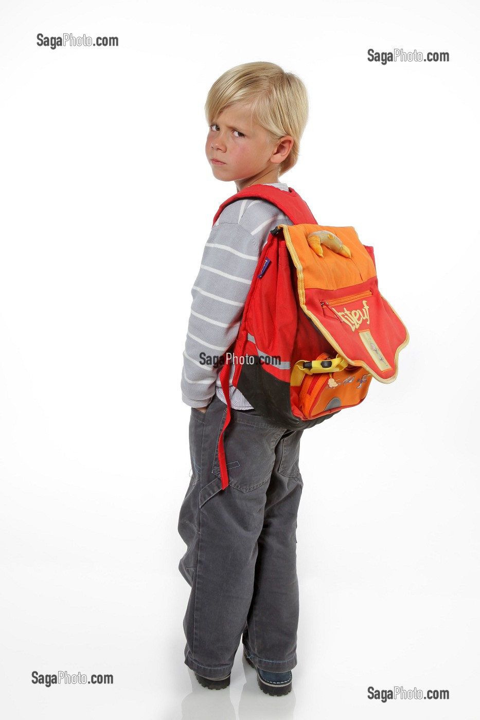 Mots clés : PHOTO COULEUR, VERTICALE, HAUTEUR, FRANCE, STUDIO, FOND BLANC, IMAGE DETOURABLE, PERSONNE, ENFANT, GARCON, ECOLIER, RENTREE DES CLASSES, CARTABLE, DOS, SE RETOURNER, FACHE, COLERE, BOUDEUR, BOUDER, MOUE, SCOLAIRE, TYPE EUROPEEN, CHEVEUX BLONDS, BLOND, REFUS, PORTRAIT, MECONTENT